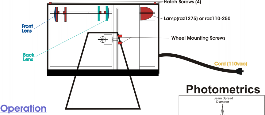 Plug cord into a 110vac outlet. Remove top hatch and focus with front lens. The smart wheel will calibrate and move from one position to another while dimming up and down.